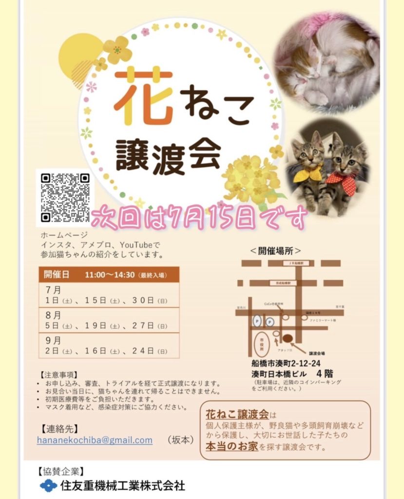 7月~9月は日曜日も譲渡会開催します! 投稿日: 2023年7月4日2023年7月4日 投稿者: hananeko-chiba 譲渡会開催のお知らせ 7月~9月は日曜日も譲渡会開催します!日程は次の通りです。↓ 7月:15日(土)、30日(日)8月:5日(土)、19日(土)、27日(日)9月:2日(土)、16日(土)、24日(日)