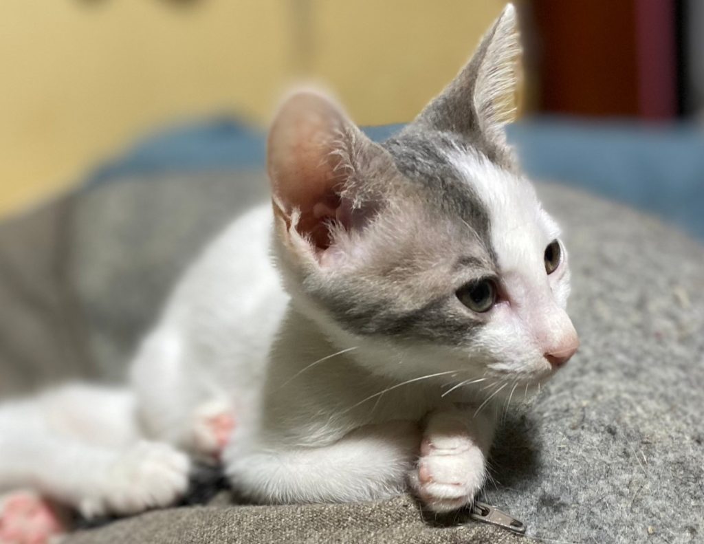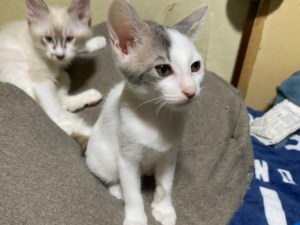 人が大好きですぐにお腹の上に乗ってきます。身体は兄妹の中で一番小さいけど、声は一番大きいです。大きい声でしっかり自己主張してる気がします。